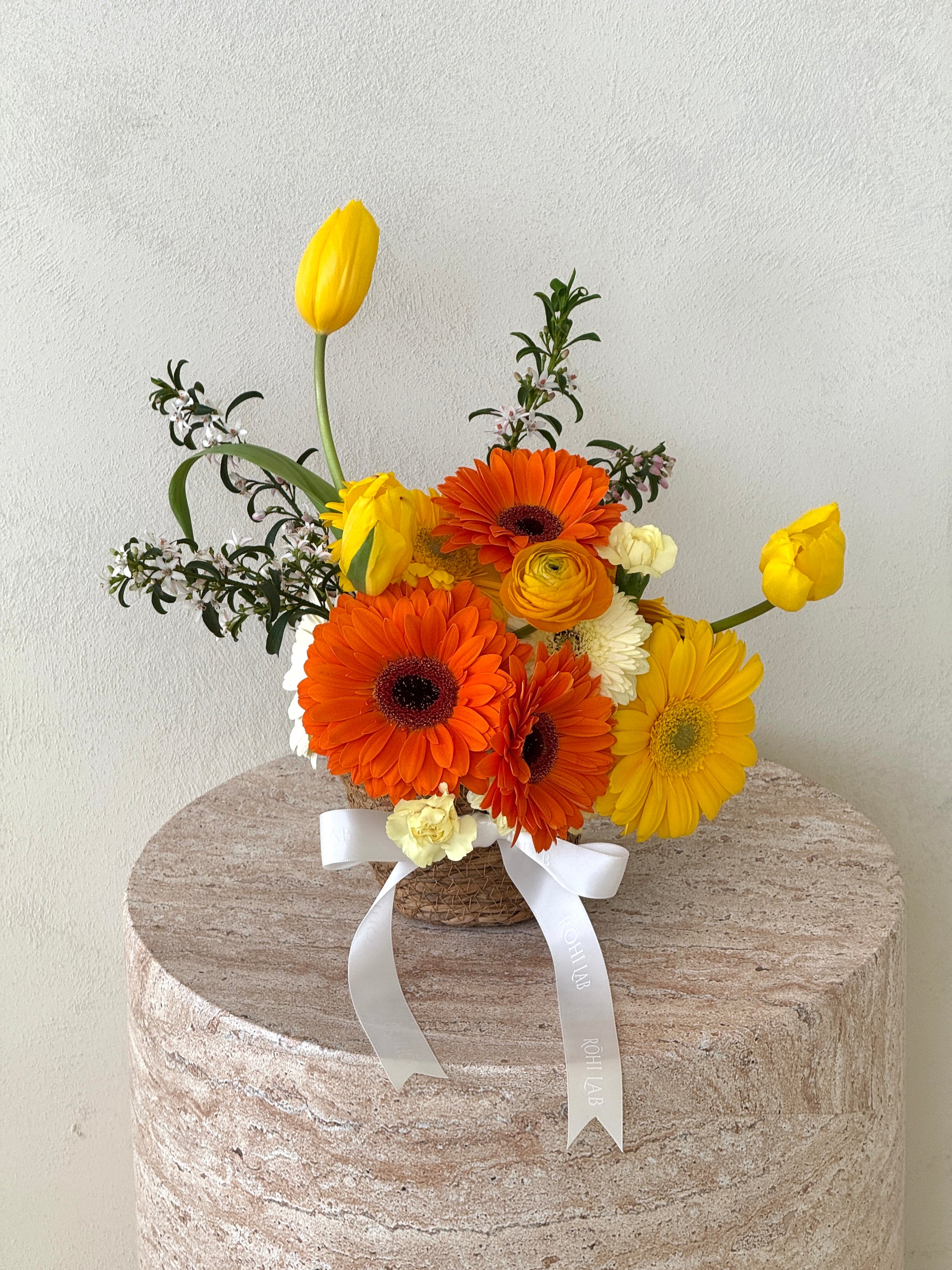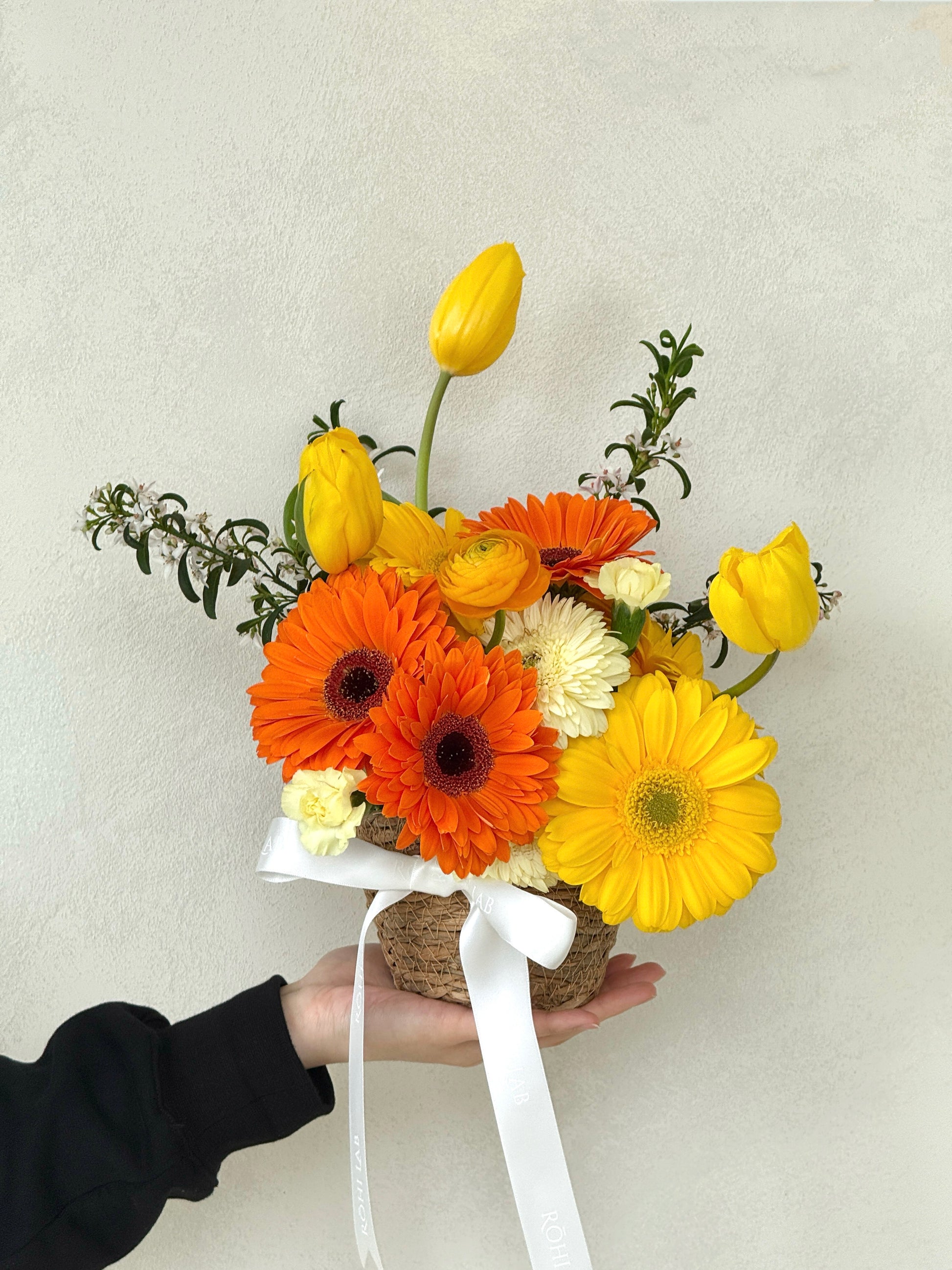 A cheerful bucket of golden gerberas, bursting with warmth and positivity. This vibrant arrangement is like a big sunny hug—perfect for brightening someone’s day or celebrating a joyful moment. This picture shows the small size, approximately diameter 25-30cm. About 15 gerberas, back also have flowers.