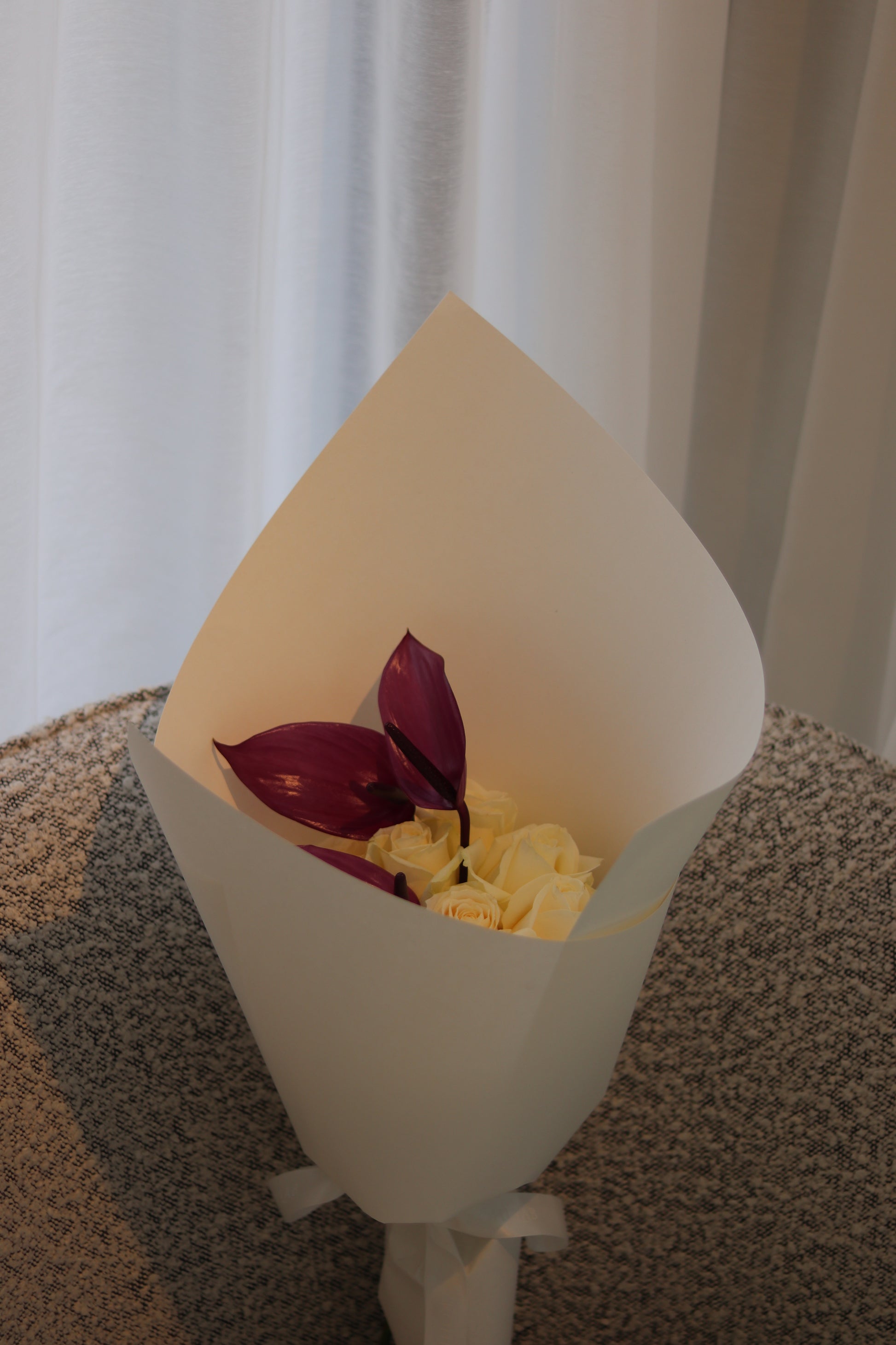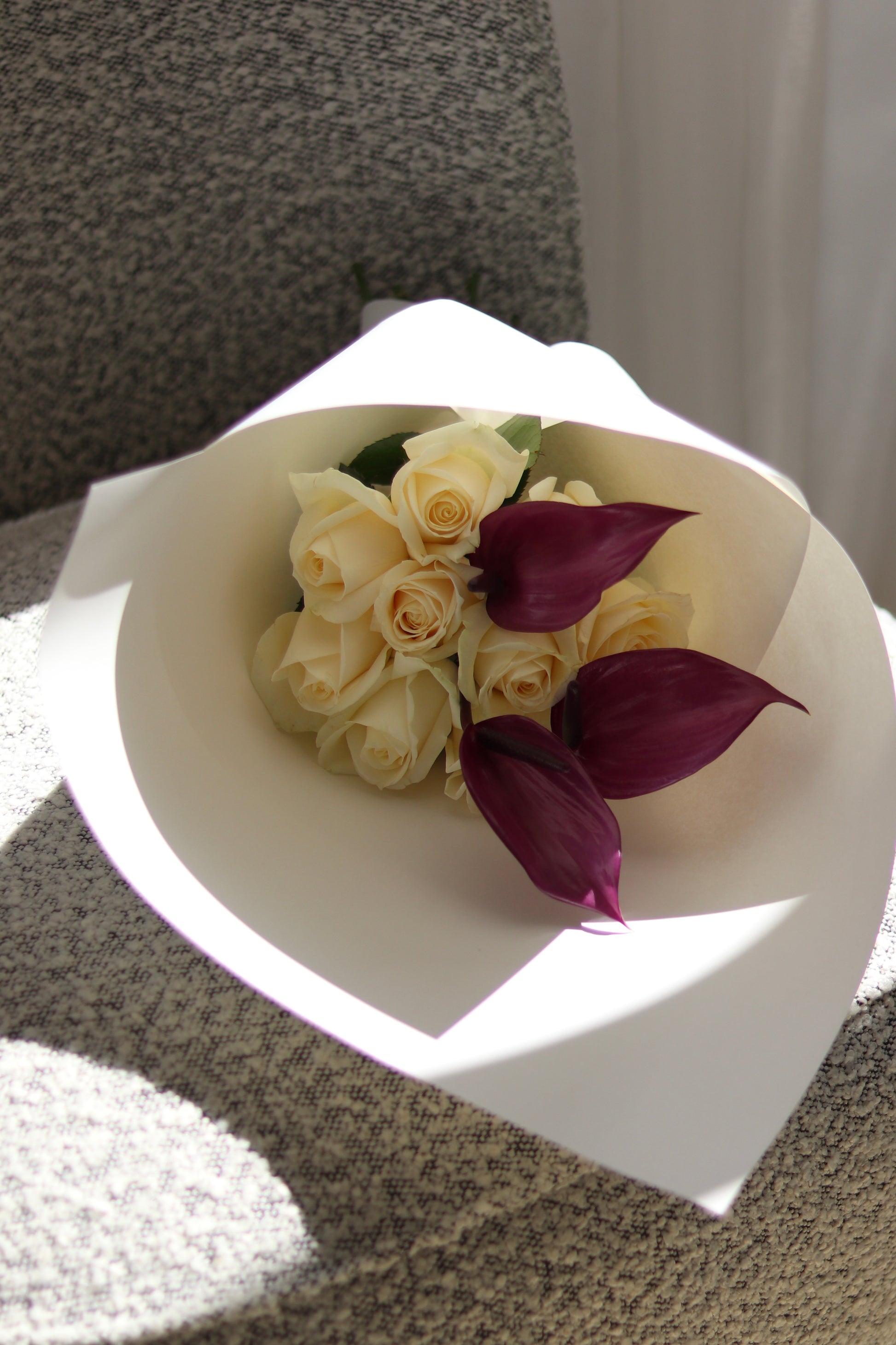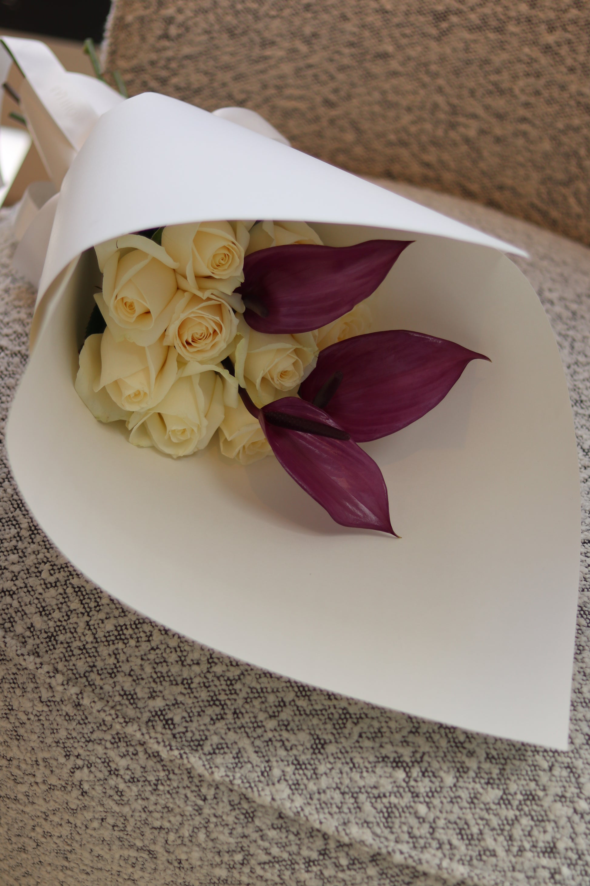 A soft and elegant combination — ivory roses paired with deep purple anthurium(Laceleaf). The ivory roses symbolize purity and grace, while the purple calla lilies add a sense of depth. Wrapped in white floral paper, the arrangement is simple, elegant, and timeless. These photos show the standard size with 10 roses and 3 anthuriums.(Large size will have 20 roses and 4 anthuriums, deluxe size will have 25 roses and 6 anthuriums)