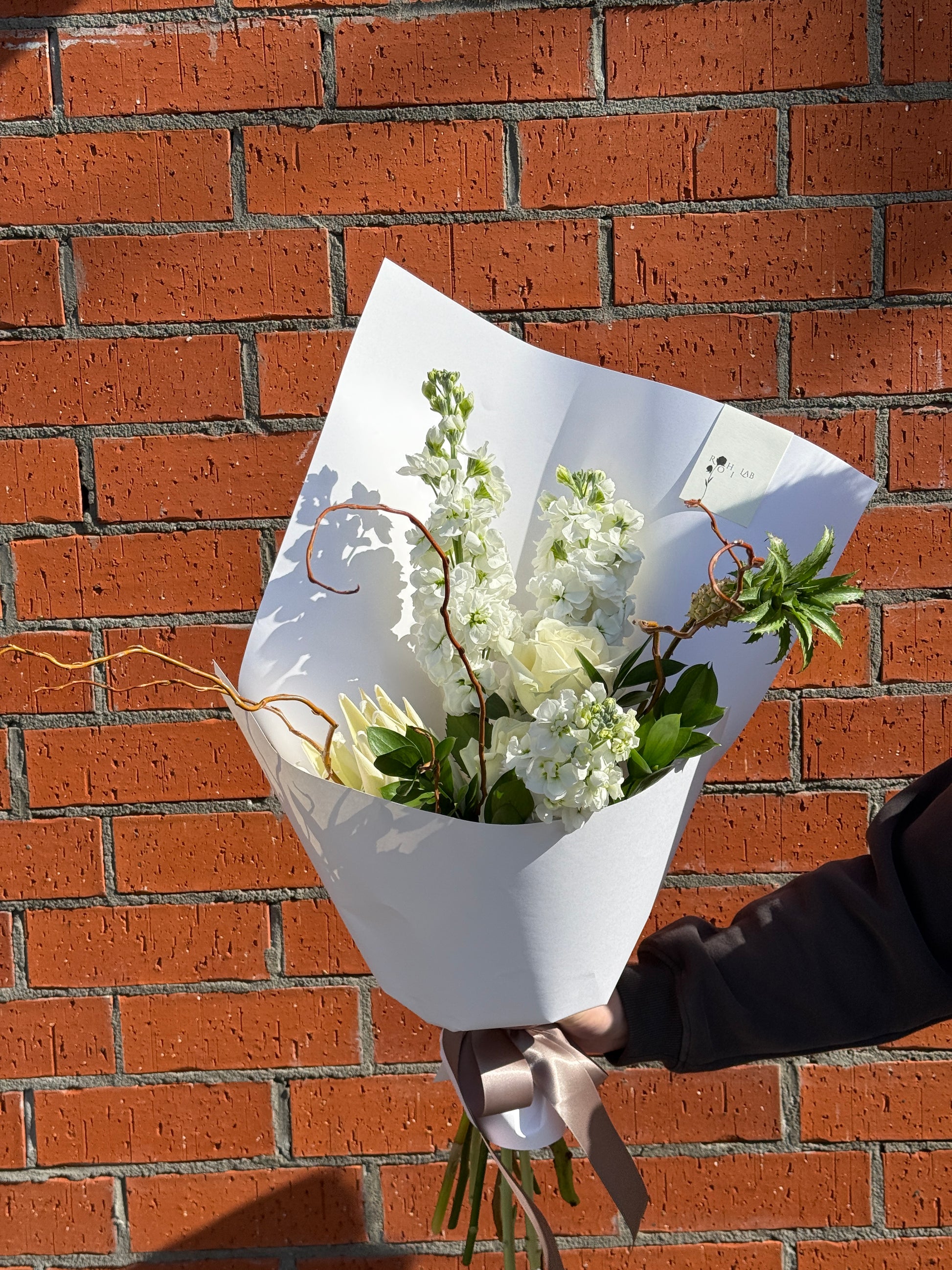 A bouquet of seasonal white and green blooms and King protea. Flowers will vary depending on market availability. If you have specific flower preferences, please get in touch with us so we can accommodate your request. The bouquets shown are Standard.